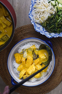 Kari Mai fun is a one-dish meal similar to fermented rice noodle topping with chicken curry except Kari Mai Fun replaces fermented rice noodle with vermicelli. It is eaten with a side dish of blanched morning glory and bean sprouts together with pickle and fried tofu.